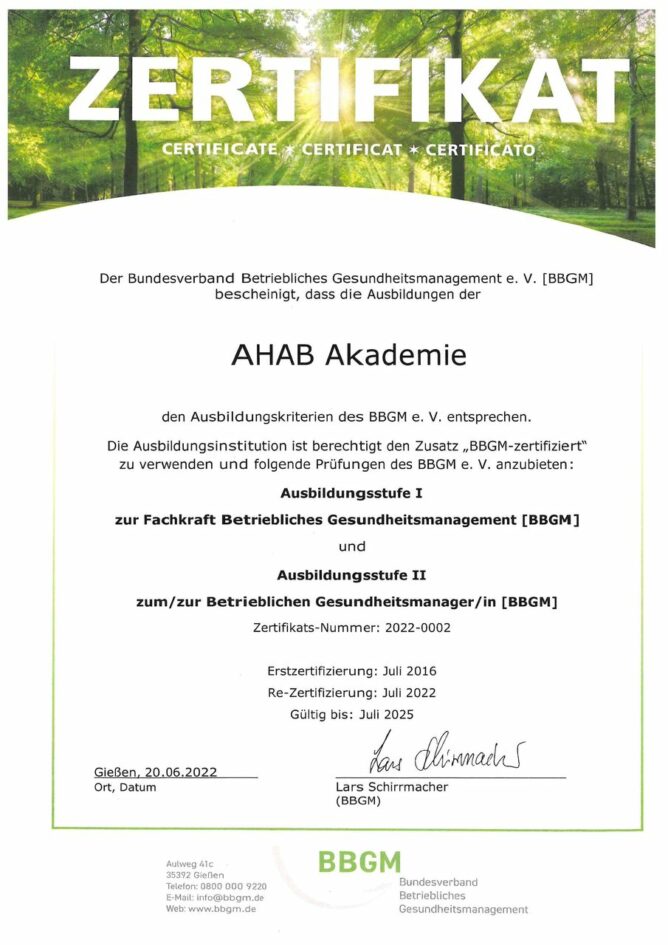 Die Ausbildung Betrieblicher Gesundheitsmanager ist erfolgreich zertifiziert beim „Bundesverband Betriebliches Gesundheitsmanagement“ (BBGM) und entspricht damit dem hohen Qualitätsstandard in allen Richtlinien und Kriterien des anerkannten Verbandes. Als Besonderheit dieser Ausbildung kannst Du im Anschluss optional die Prüfung beim BBGM absolvieren und von diesem starken Netzwerk mit exklusiven Vorteilen profitieren.